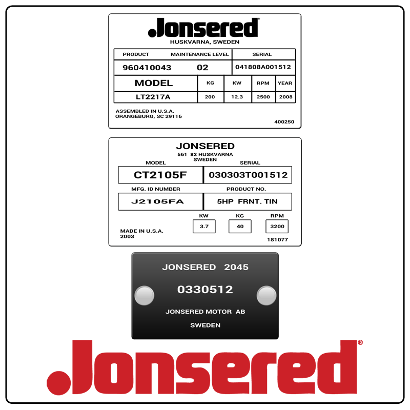 Your Jonsered equipment has a factory model number and serial number on a sticker-like label or metallic tag attached to the unit in a place away from moving parts (usually near the handle, under the seat, or on the side of the unit). The best way to buy repair parts for your Jonsered is to begin by searching for your Jonsered model number on PartsTree and use the OEM Jonsered parts diagrams to find the parts that fit exactly like the originals from the Jonsered factory. When you locate your Jonsered model tag, take a picture for future repair parts needs.