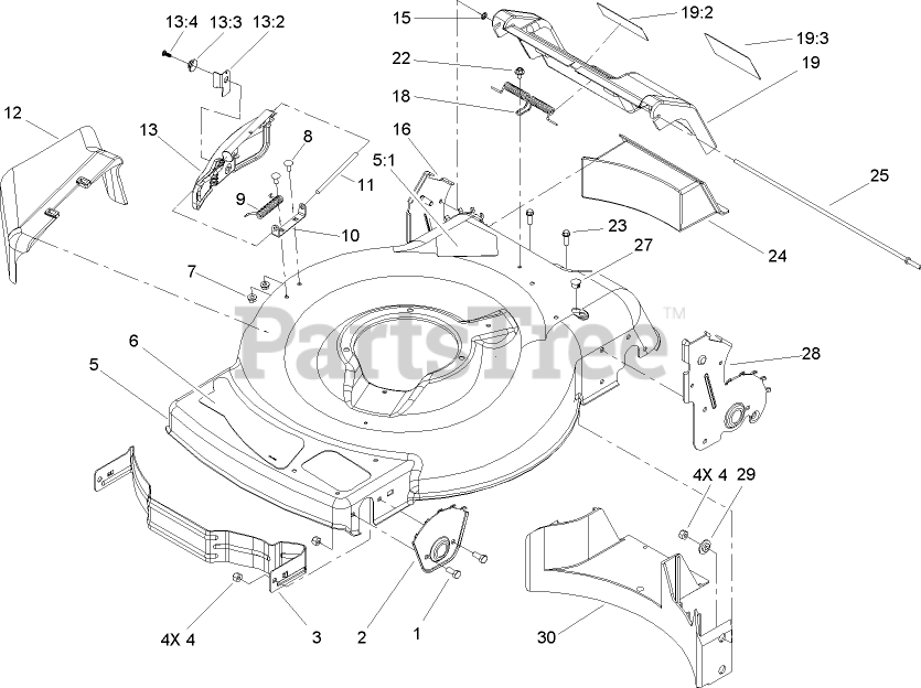 Deck, Side Chute and Rear Door Assembly Parts Diagram