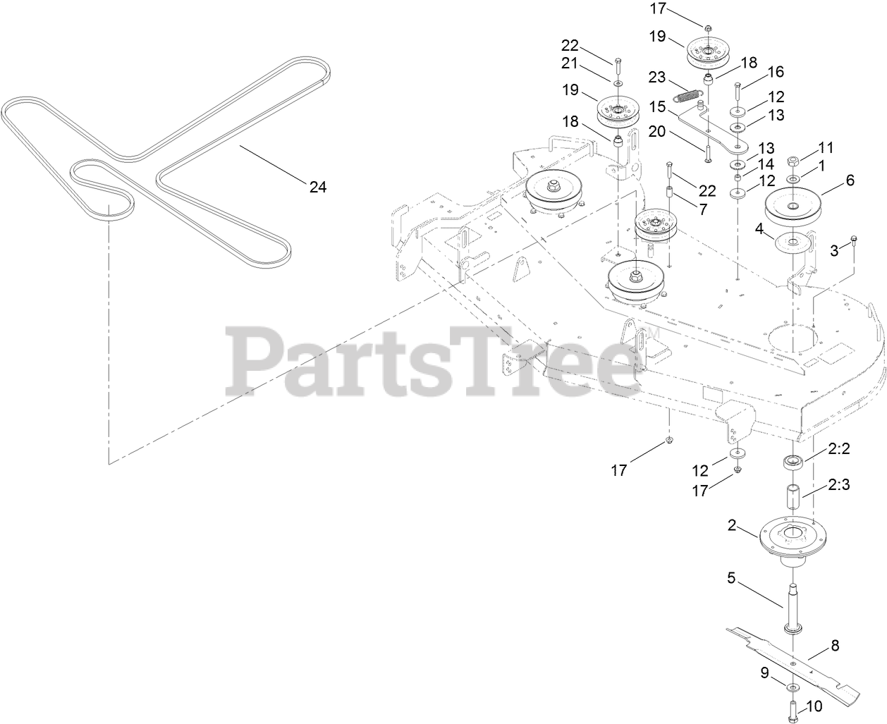 60 Inch Deck, Belt and Mulch Blade Assembly Parts Diagram