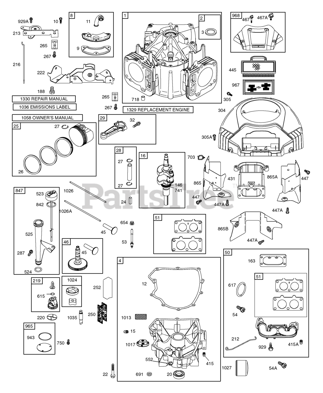 Note: Included in Engine Gasket Set, Key. No. 358; Included in Carburetor Overhaul Kit, Key. No. 121; Included in Carburetor Gasket Set, Key. No. 977