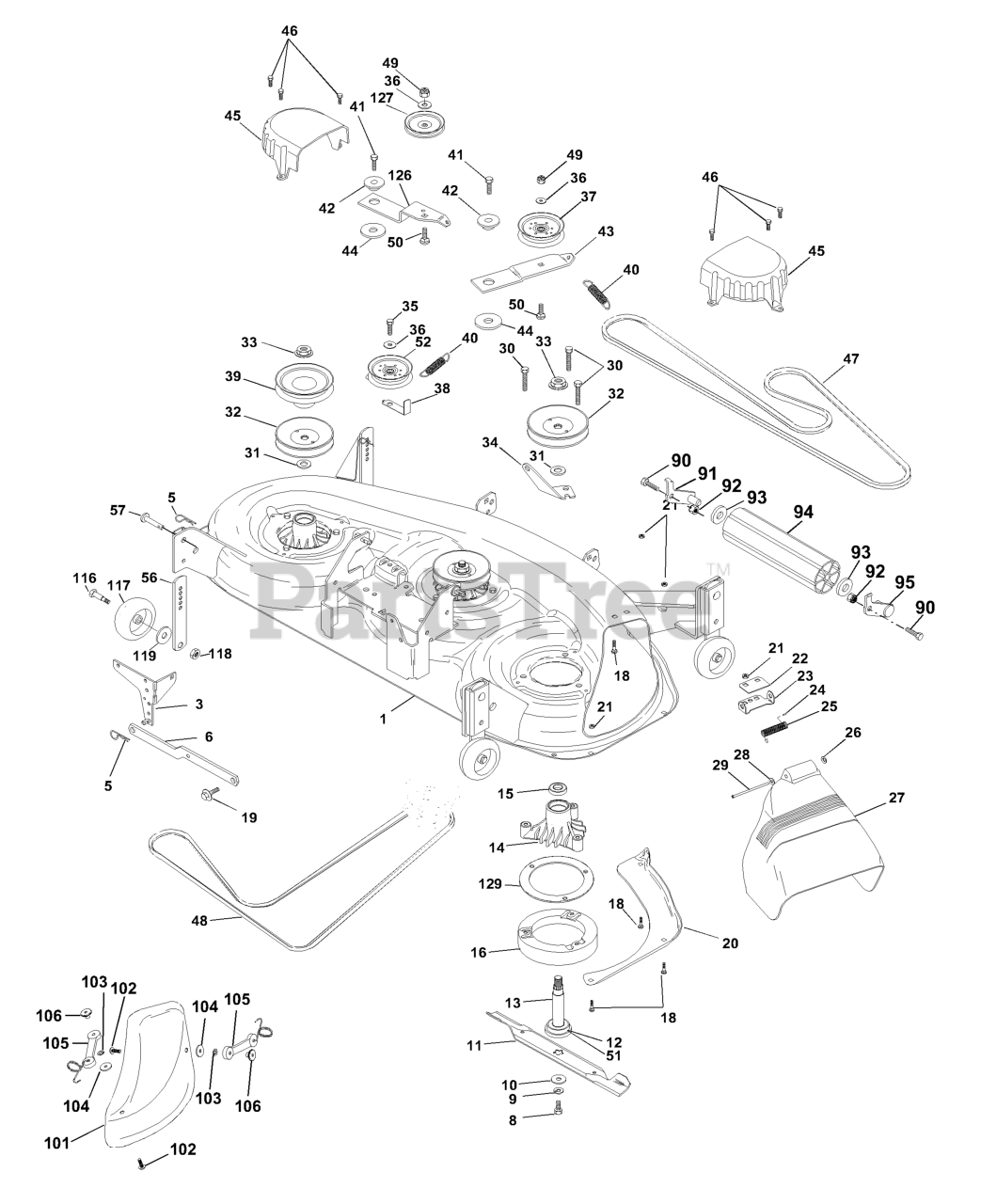 Note: Complete. (Std. Deck-Order separately nose roller and gauge wheel components Key Nos. 90-95 and 116-118)