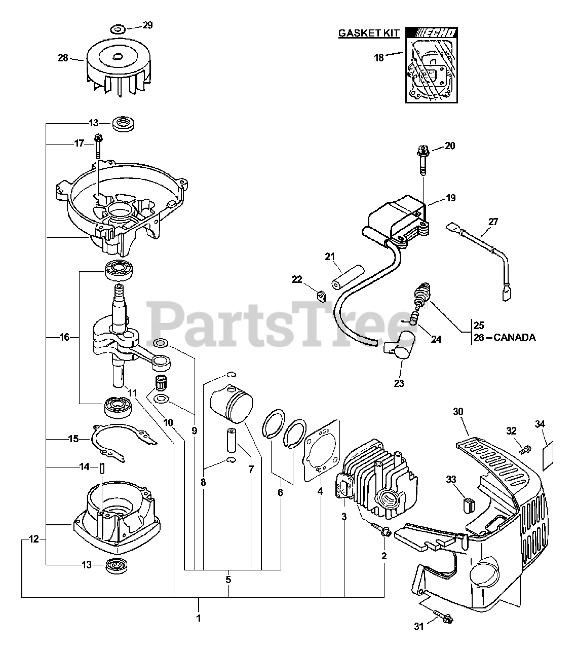 HC-200 - Echo Hedge Trimmer (SN: 05001001 - 05999999) Engine, Short Block, Ignition, Cylinder Cover Parts Diagram