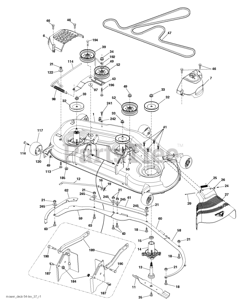 Note: MANDREL ASSEMBLY (includes Housing (Key 14) Shaft Assembly (Key 13) and Bearing Only (Key 15) and (Key 33) Pulley /Washer and Blade Bolt /Washers Not Included)