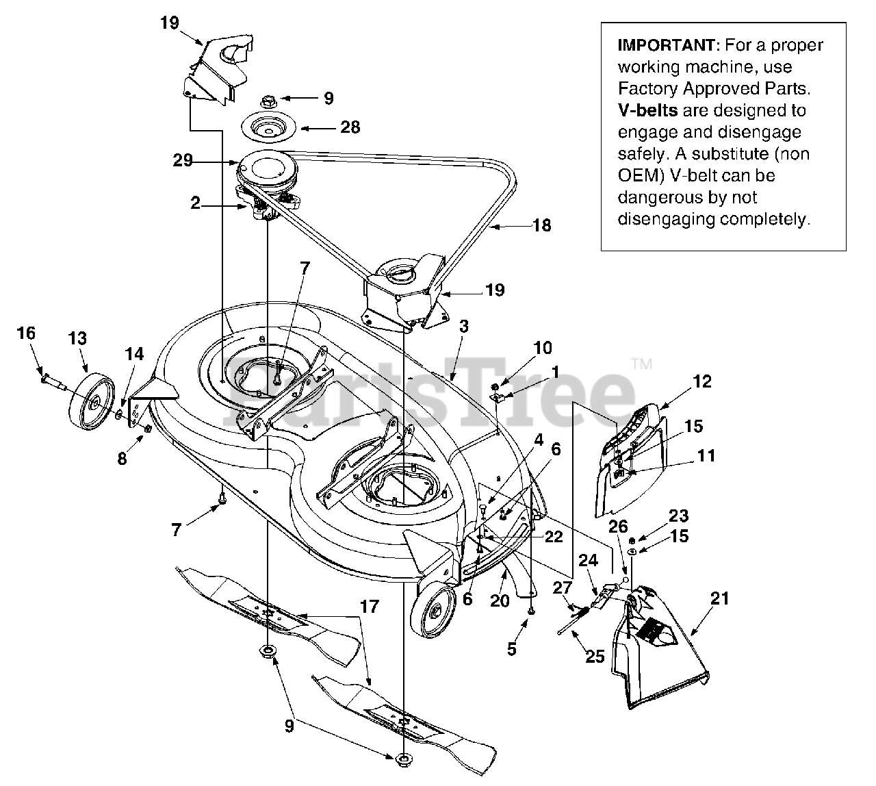 Note: Deck pulley and blade nuts must be torqued to 100 ft. lbs. if removed or replaced.