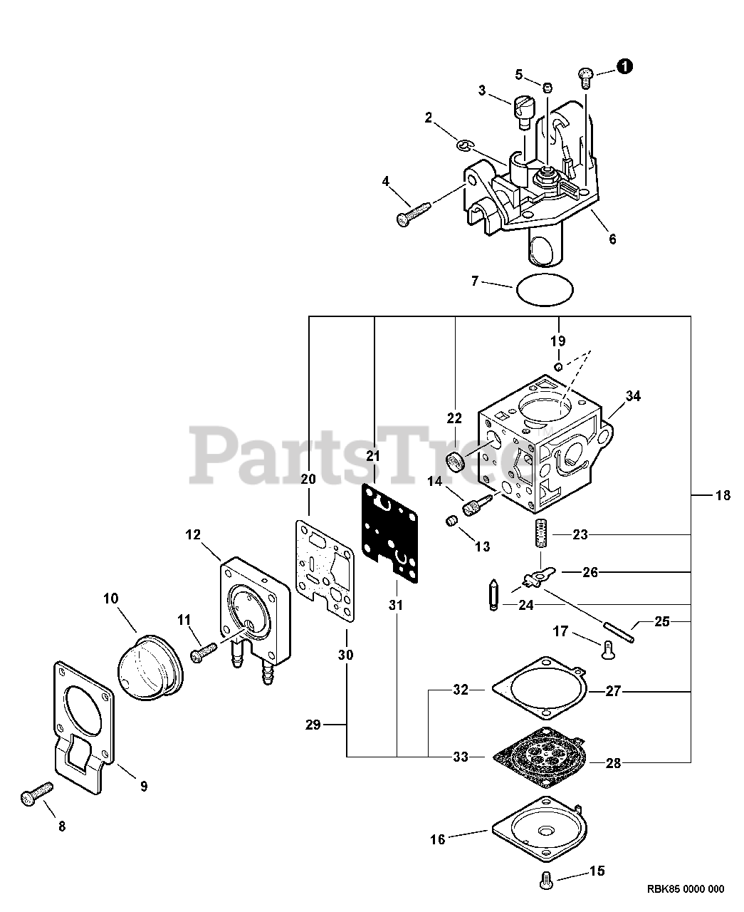 Handheld blower, 330 mm x 265 mm x 360 mm (L x W x H), 4.1 kg dry weight. Powered by a 25.4 cc, air-cooled, 2-stroke single-cylinder gasoline engine (34 mm bore, 28 mm stroke) with a diaphragm carburetor (RB-K85) and flywheel magnet ignition.