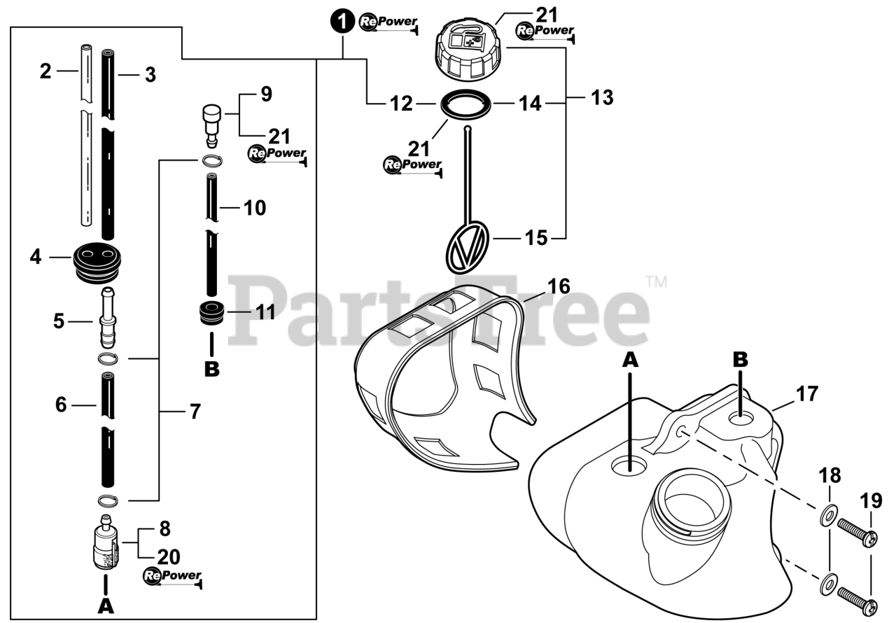 PB-255LN Echo handheld blower: a single-cylinder 2-stroke engine (25.4 cc, short-block SB1092); RB-K90 diaphragm carburetor with high-speed needle and 2-stage metering; NGK BPM8Y/BPMR8Y spark plugs; 16.9 fl (~0.6 L) fuel capacity.