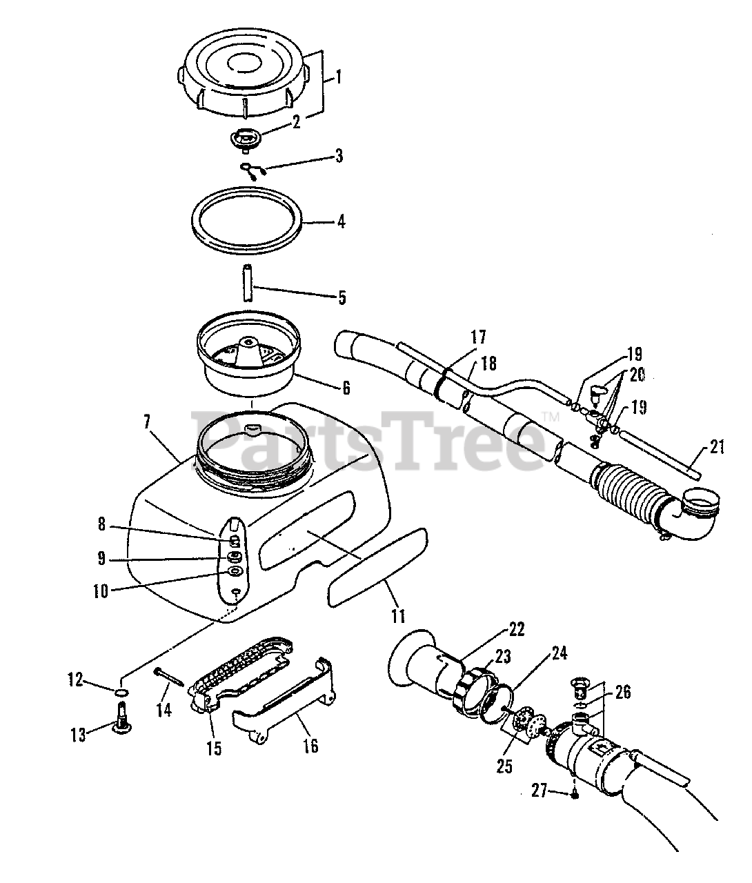 Backpack blower with 2-cycle air-cooled single-cylinder engine (30.8 cc) featuring a Walbro diaphragm carburetor and CDI ignition (NGK BPM-7A/Champion CJ-7Y). Dimensions 32x41x42 in.