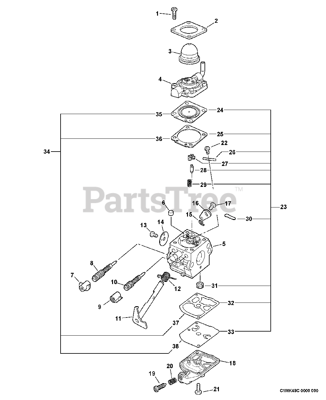 PB-603 Echo Backpack Blower: 58.2 cc, air-cooled, 2-stroke, single-cylinder engine (bore 46 mm, stroke 35 mm). Compact 320 mm x 460 mm x 480 mm with side handle, dry weight 8.7 kg. Equipped with C1M-K49C carburetor, fuel tank, blower fan, and air-filter assembly. Operates at 72 dB(A).