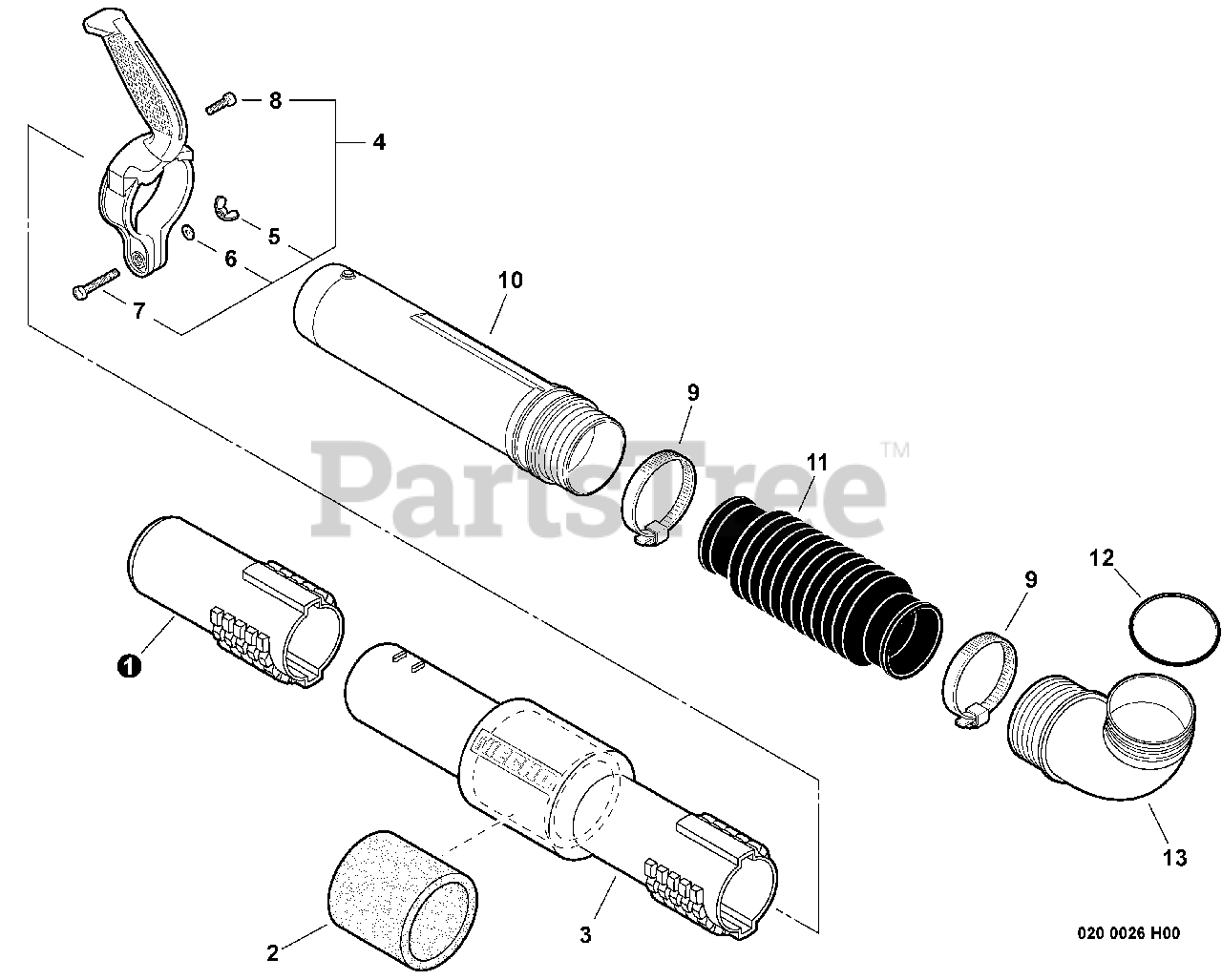 63.3 cc 2-stroke backpack leaf blower (low-noise LNH), hip-mounted throttle, diaphragm carburetor, 68.3 fl oz see-through fuel tank. Delivers 535 CFM at 214 mph, operates at 65 dB(A). Standard starting. Ideal for quick, quiet clearing.
