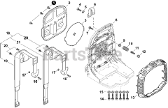 Backpack Blower - 63.3 cc two-stroke, air-cooled engine with diaphragm carburetor. 68.3 fl oz fuel tank. 756 CFM airflow at 234 mph nozzle. 74 dB(A) noise. Dry weight 9.8 kg (21.6 lb). Dimensions (no pipes): 375 x 190 x 475 mm (14.8 x 19.3 x 18.7 in).