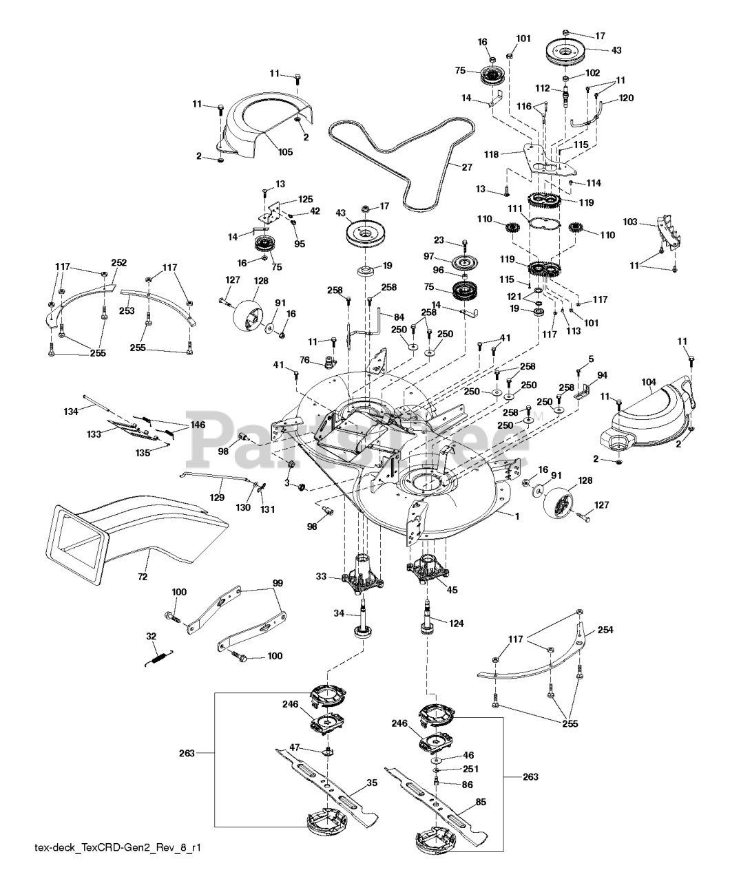 Note: MANDREL ASSEMBLY SHORT (Includes Housing (key 45) Shaft Assembly (key 124) and Bearing (key 19) only- Pulley /Nut /Washer and Blade Bolt /Washers Not Included)