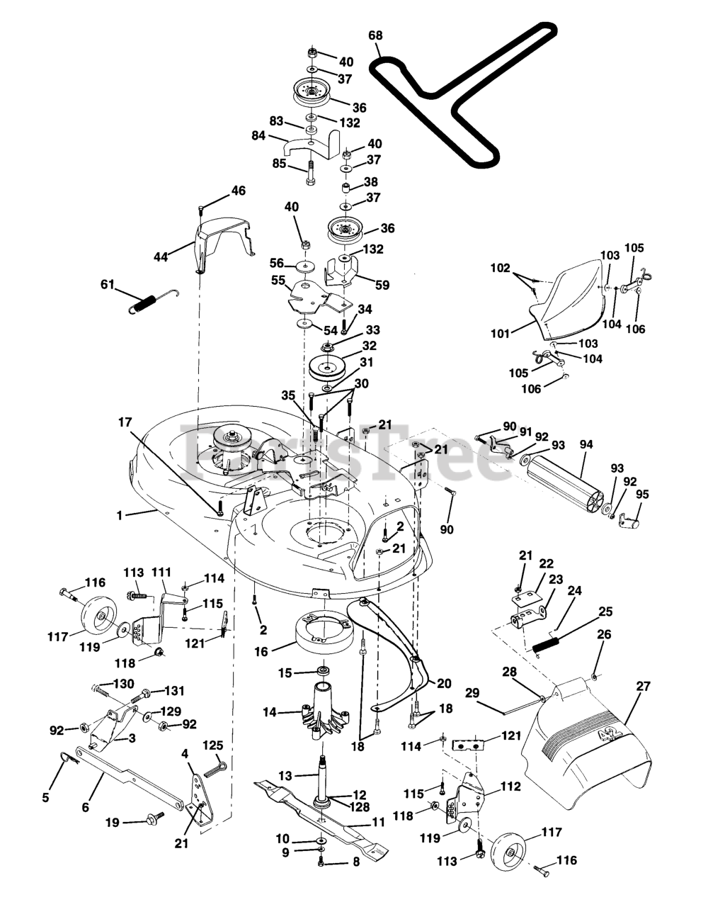 Note: (Standard Deck - Order Nose Roller, Gauge Wheel and Mulcher Plate components separately Key Nos. 90-95, 101-106 and 111-121)