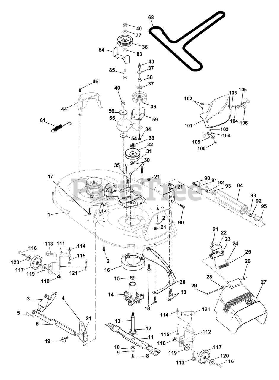Note: (Standard Deck - Order Nose Roller, Mulch Cover and Gauge Wheel components separately Key Nos. 90-95, 101-106, and 111-121)