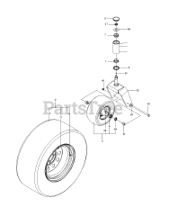Tires surround a wheel's rim to transfer the equipment's load from the axle and provide traction on the surface. Tires can be found on larger outdoor power equipment, and on equipment designed to go over rough and slippery terrain. Many tires on lawn equipment are semi-pneumatic, light weight, and puncture proof. Tires on lawn equipment are usually easily replaced, by removing the wheel from the axle, deflating the tire, and removing the tire from the wheel.